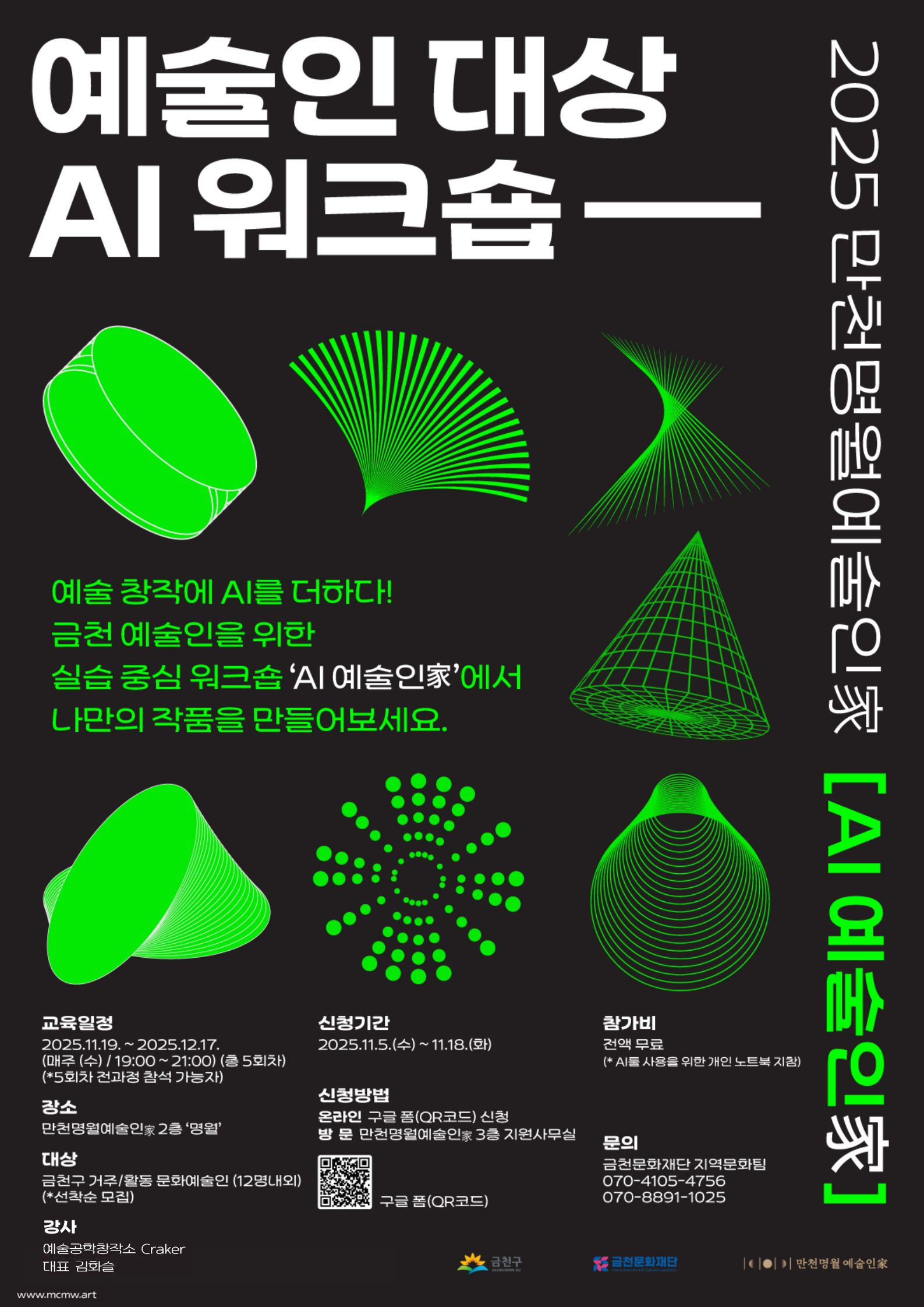 안녕하세요, 정말 오랫만에 홈페이지에 새글을 올립니다. 그동안 인스타그램과 페이스북 등 소셜미디어를 통해 간간히 소식을 전했는데요, 그러느라 게시판은 최신 소식에 뒤쳐져 있었습니다. 최근 사이트 방문자가 소폭 늘어 현재 진행중인 교육 소식을 전해봅니다.  이번 교육은 특히 금천구의 문화예술인을 대상으로 AI를 활용해 작품을 만드는 과정을 진행해보는 의미있는 교육으로 총 12분의 참여 예술인 분들이 매주 활동에 열정적으로 참여해주고 계십니다. 교육이 종료되면 온라인으로도 결과 공유가 이루어질 예정이니 많은 관심 부탁드립니다.